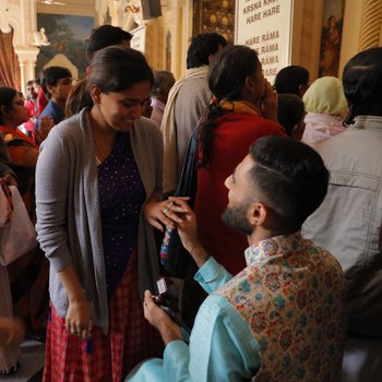 During a fiery kirtan, in front of the deities Sri Sri Krishna-Balaram, Radha-Shyamsundar and Gaura-Nitai, I approached Manasvi in the temple room. Her mother walked up to me from the side and took my ring and snuck it to the priest who put it in the feet of the deities for blessings. A few minutes later her mother approached me and snuck it back into my hands behind my back. I inched towards Manasvi nervously, my heart beating faster than ever, the kirtan speeding up intensifying the feeling. Over the volume of the kirtan, I made an attempt to read out a speech that I had spent so much time thoughtfully writing.